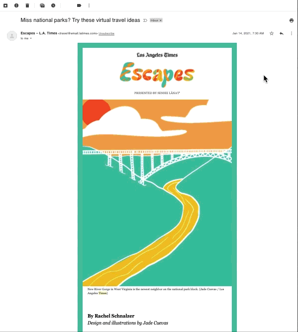 One of my biggest digital efforts is working on the Escapes Newsletter. Each week Rachel Schnalzer breaks down travel tips — which are predominantly virtual these COVID-19 days — for our readers to use and draw their own travel inspiration from. I art directed the newsletter logo that was masterfully done by Natalie Avalos (aka @threeologie on Instagram). I art direct all the art in each issue and anything else Escapes may need (i.e. promos or sign up page images).